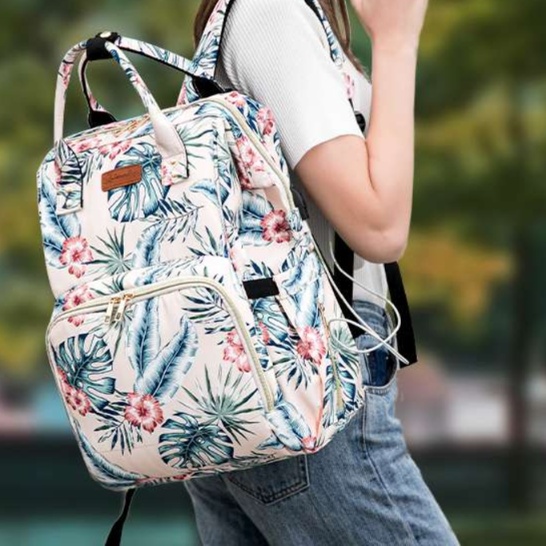 華やかな南国風デザインが目を引くマザーズリュックです。