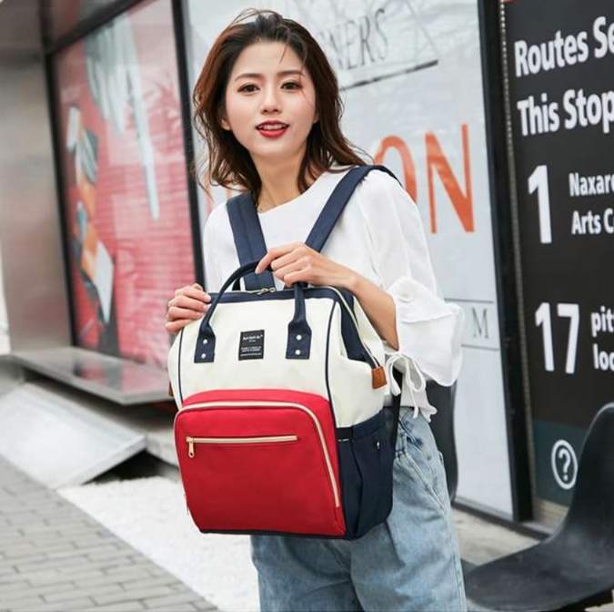 ホワイト、ネイビー、レッドの3色カラーブロックデザインが目を引く小さめマザーズバッグです。
