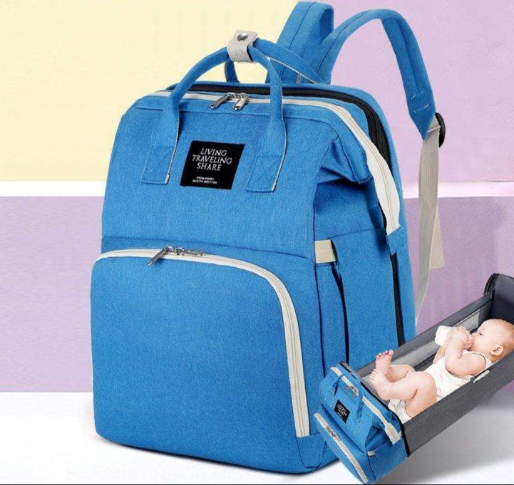 鮮やかなブルーカラーが目を引くマザーズバッグです。