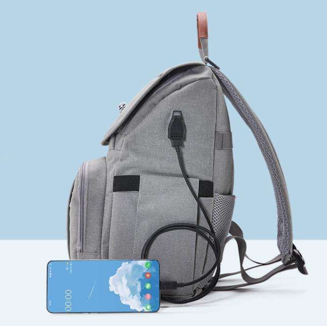 機能的なマザーズバッグリュック。大容量メインポケットと充電ポート付きで実用性抜群。