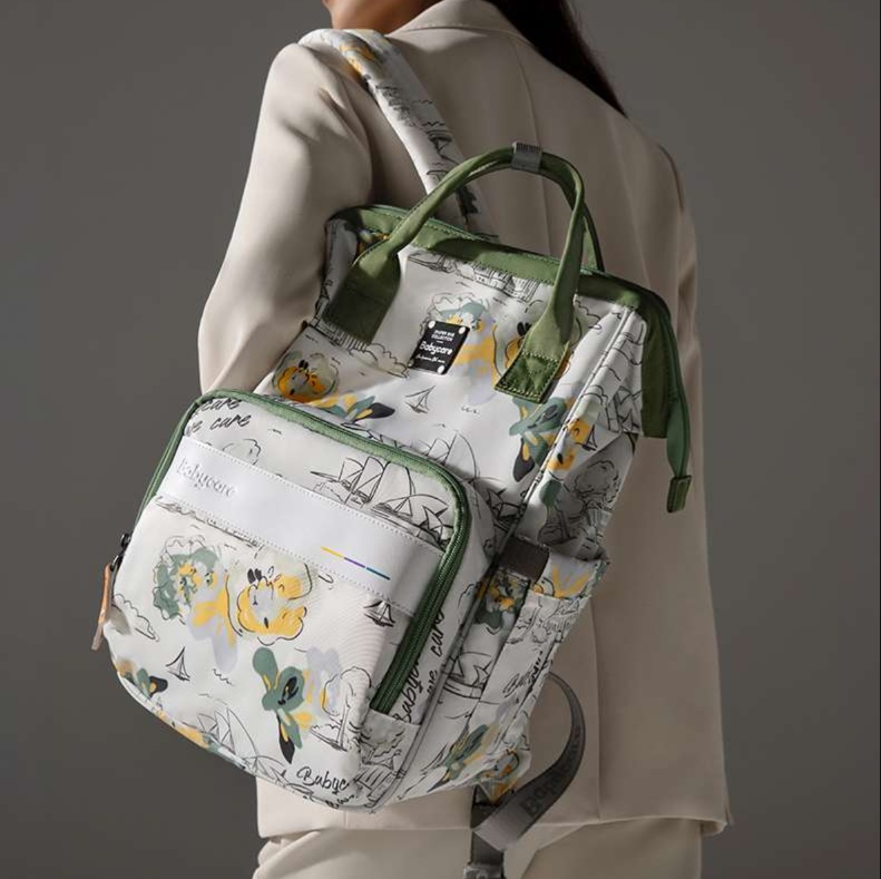 防水性と耐久性に優れたマザーズバッグ型リュック。かわいいイラストと建物のスケッチが施され、子どもとのお出かけを楽しく演出。必要なアイテムを整理整頓できる収納力を備え、背負いやすいデザインで長時間の外出も快適。育児をサポートする実用的な一品。