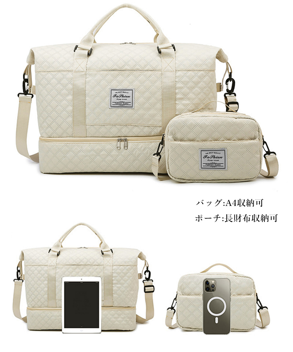 素材:ポリエステル カラー:ブラック/アイボリー/グレー/ネイビー/ラベンダー/サーモンピンク/パープル サイズ: バッグ 高さ:約42cm 上横幅:約65cm 底横幅:約48cm マチ:約23cm 持ち手高さ:約25cm 持ち手長さ:約40cm(調節不可、取り外し不可) ショルダー:約70-130cm(調節可、取り外し可) ポーチ 高さ:約15cm 底横幅:約23cm マチ:約6cm 持ち手高さ:約3cm 持ち手長さ:約15cm(調節不可、取り外し不可) ショルダー:約60-110cm(調節可、取り外し可) 収納について バッグ ・A4対応(22×31cm):〇 ・ipadmini対応(19.6×13.5×0.7cm):〇 ポーチ ・長財布(10×20cm):〇 ・ペットボトル横向き(500ml):〇 ・ペットボトル縦向き(500ml) 重さ:約696g 裏地:あり 内ポケット:あり
