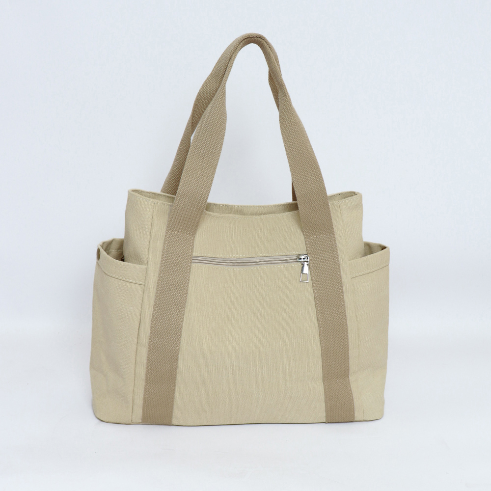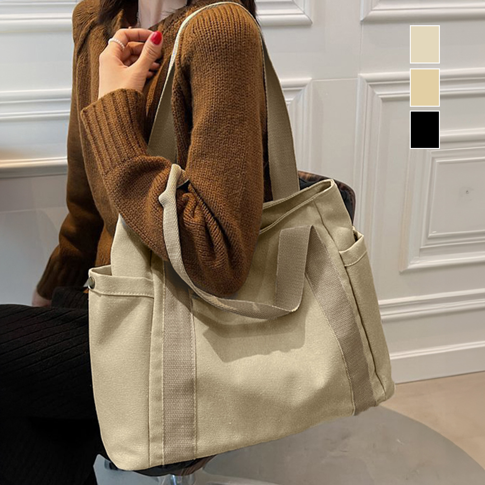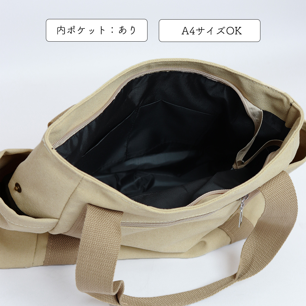 素材:キャンバス+ポリエステル カラー:ブラック/ベージュ/ライトベージュ サイズ: 高さ:約29cm 底横幅:約37.5cm マチ:約12cm 持ち手高さ:約19cm(調節不可、取り外し不可) 重さ:約374g 裏地:あり 内ポケット:あり ※すべて平置きサイズです(採寸方法違いより、多少の誤差がございますので、ご了承ください)。