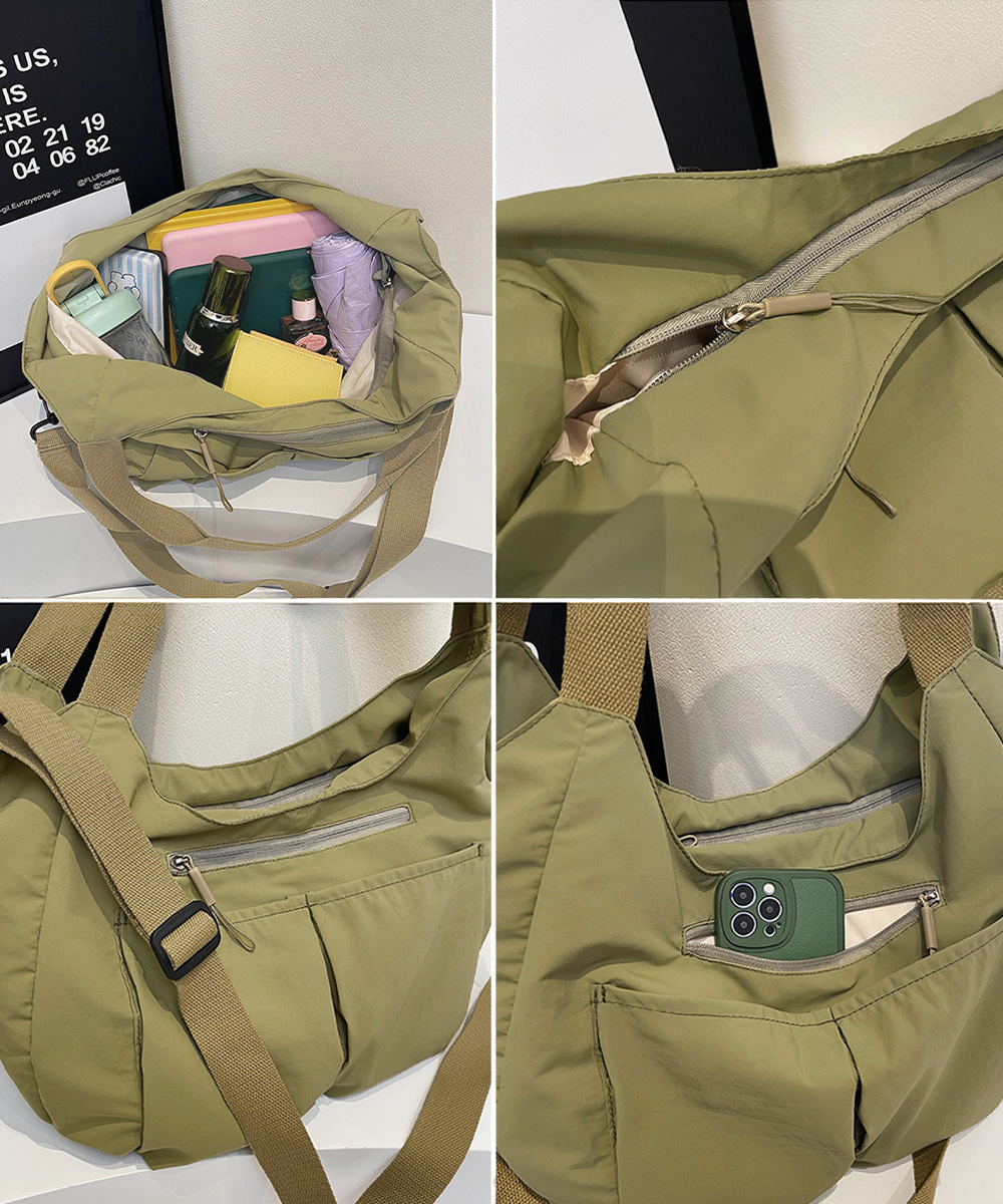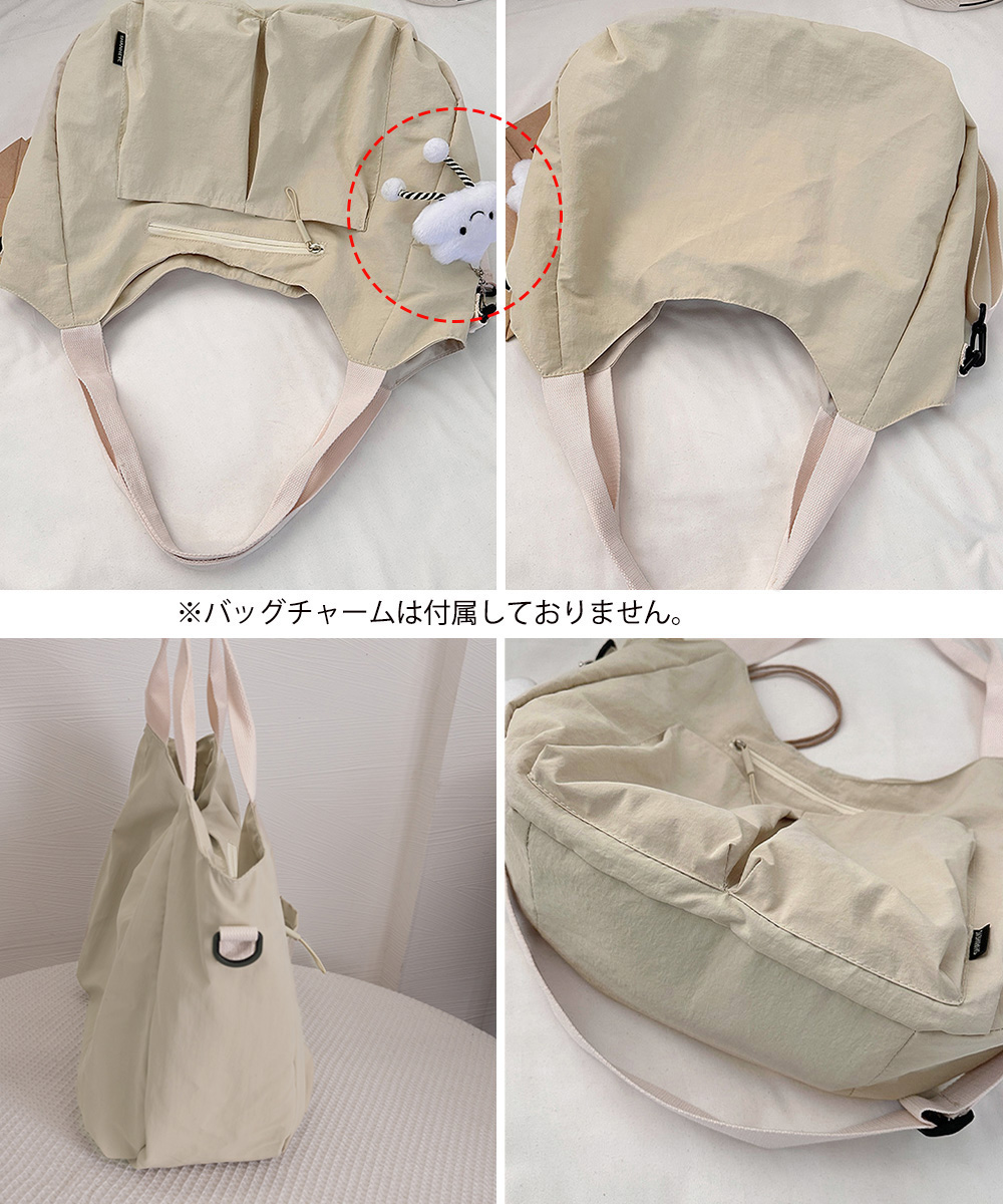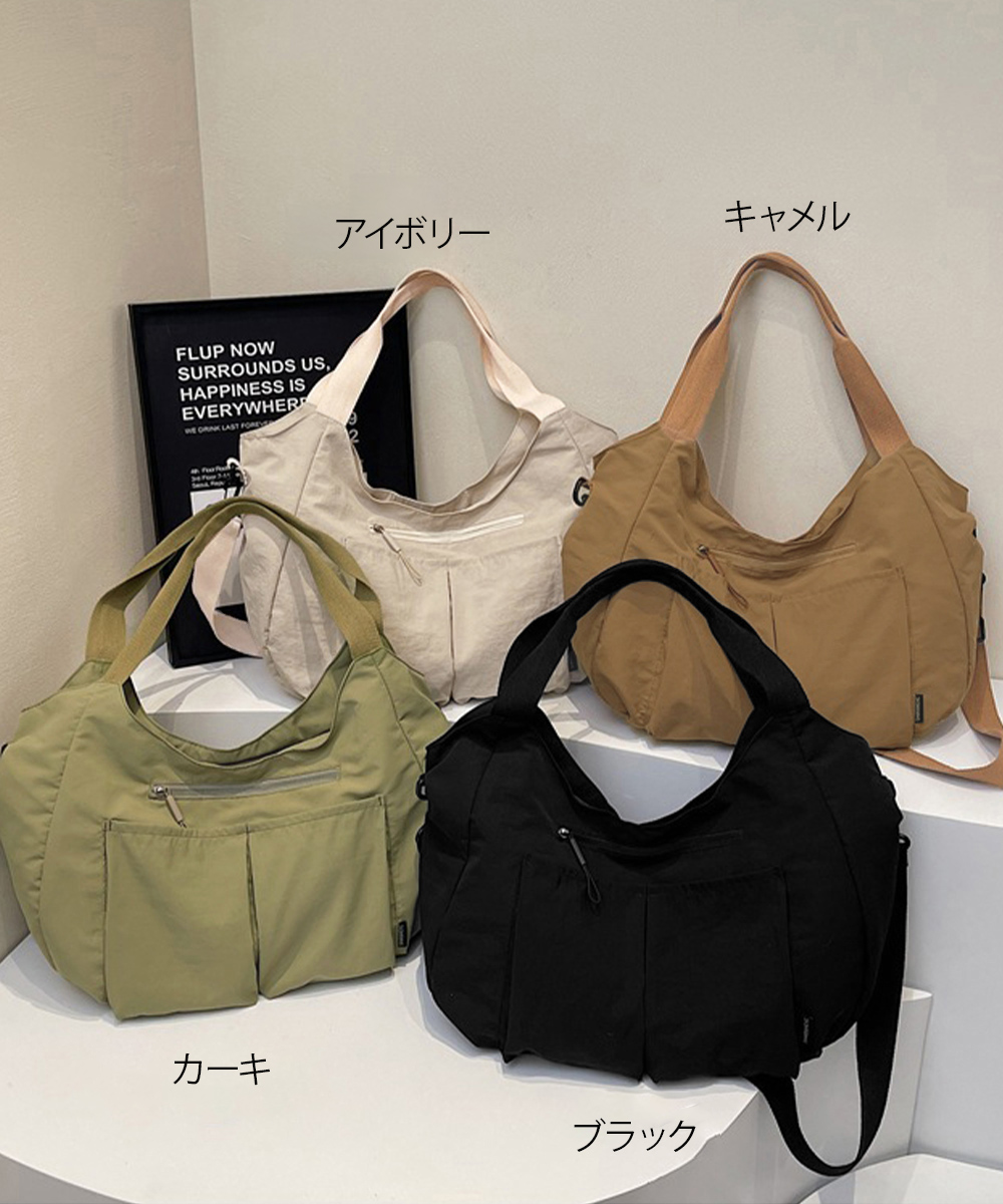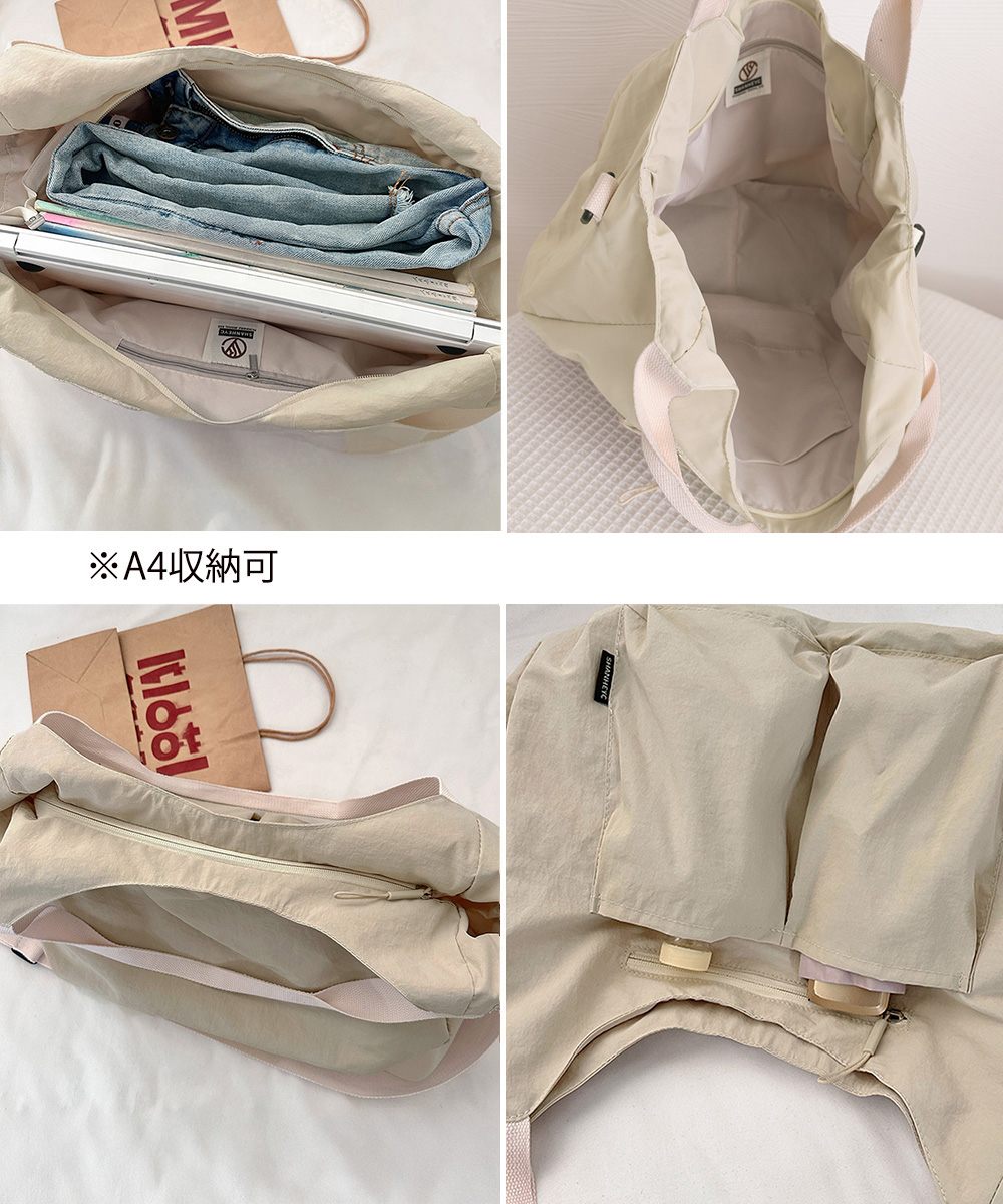 素材:ナイロン+ポリエステル カラー:ブラック/アイボリー/カーキ/キャメル サイズ: 高さ:約34cm 上横幅:約36cm 底横幅:約43cm マチ:約13cm 持ち手高さ:約21cm 持ち手長さ:約44cm(調節不可、取り外し不可) ショルダー:約62-112cm(調節可、取り外し可) ■収納について ・A4対応(22×31cm):〇 ・iPadmini対応(19.6×13.5×0.7cm):〇 ・長財布(10×20cm):〇 ・二つ折り財布:〇 ・キーケース:〇 ・ペットボトル横向き(500ml):〇 ・ペットボトル縦向き(500ml):〇 重さ:約280g 裏地:あり 内ポケット:あり